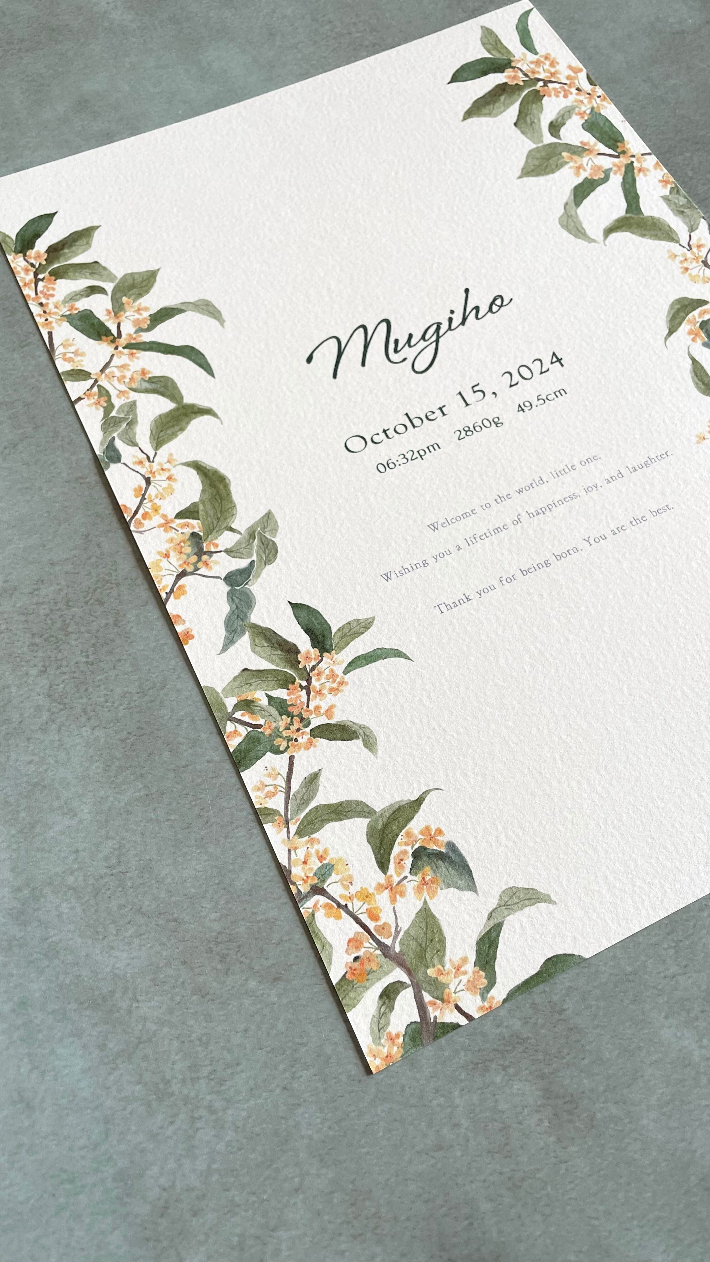 インテリアに馴染む命名書です。